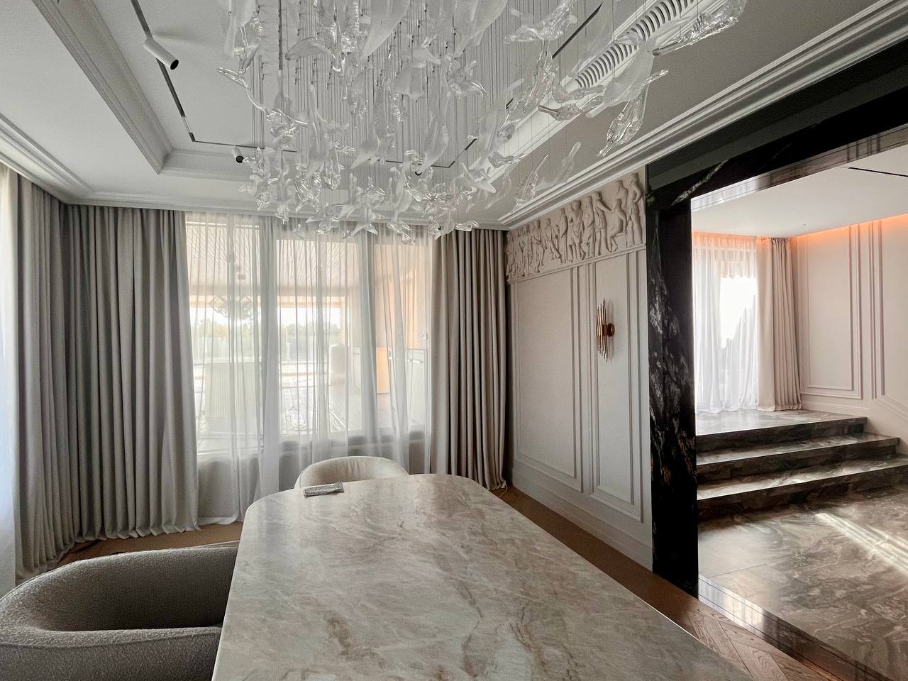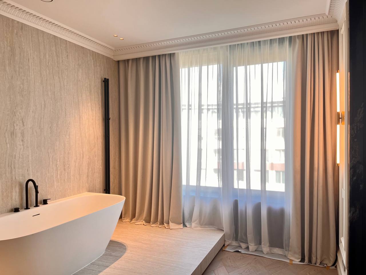 - Монтаж карнизов, отпаривание и развеска штор (услуга «под ключ»).